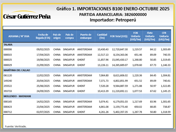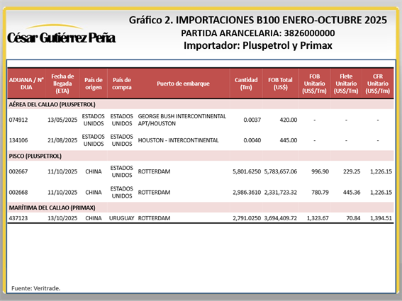 Hay diversas conclusiones que se pueden deducir del gráfico 1. En primer lugar, en todos los casos el origen del B100 declarado a Sunat Aduanas es China y en 10 meses se totalizó ingresos por 94.6 MTm, convirtiéndose en la principal empresa importadora de B100 de nuestro país.